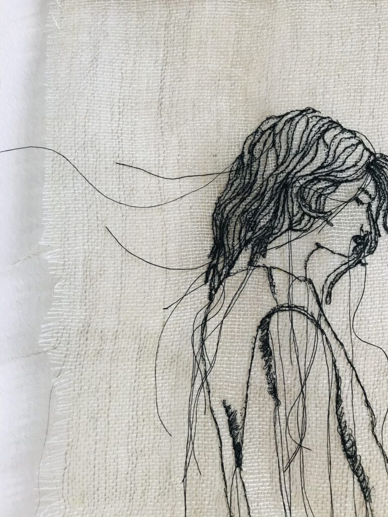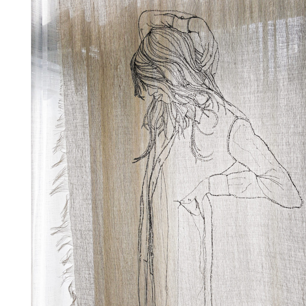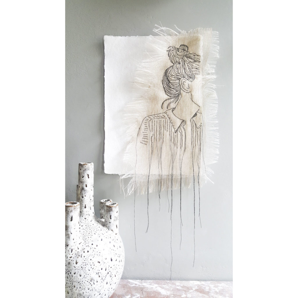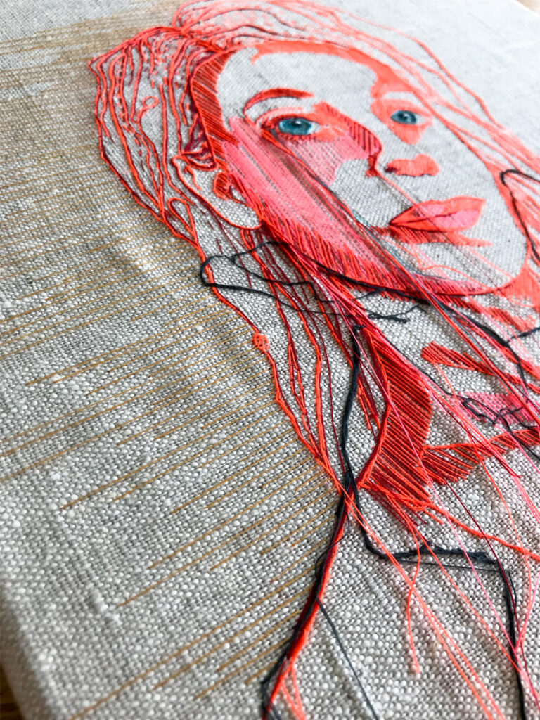 NL | Gefotografeerd fashion model geportretteerd in de vorm van embroidery art. Het artwork is geborduurd en geregen op een mix van katoen en wol. Doordat de stof heel grof is gewoven, en het artwork hierdoor niet strak kan worden geborduurd, ontstaan er een licht 3D effect. Door de transparantie lijkt het artwork te zweven op de stof.