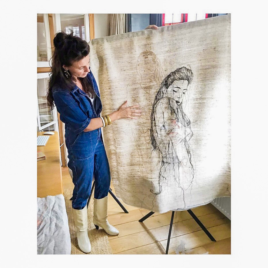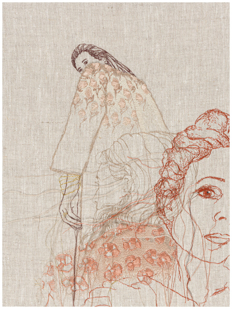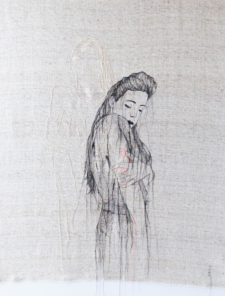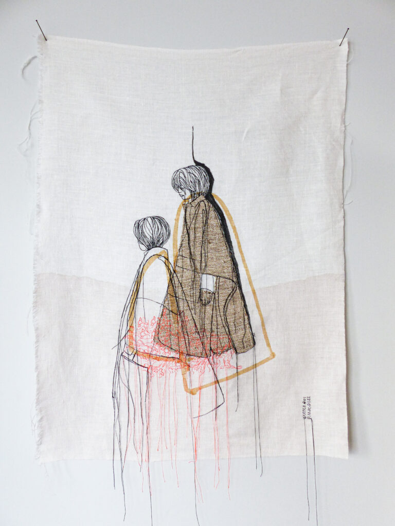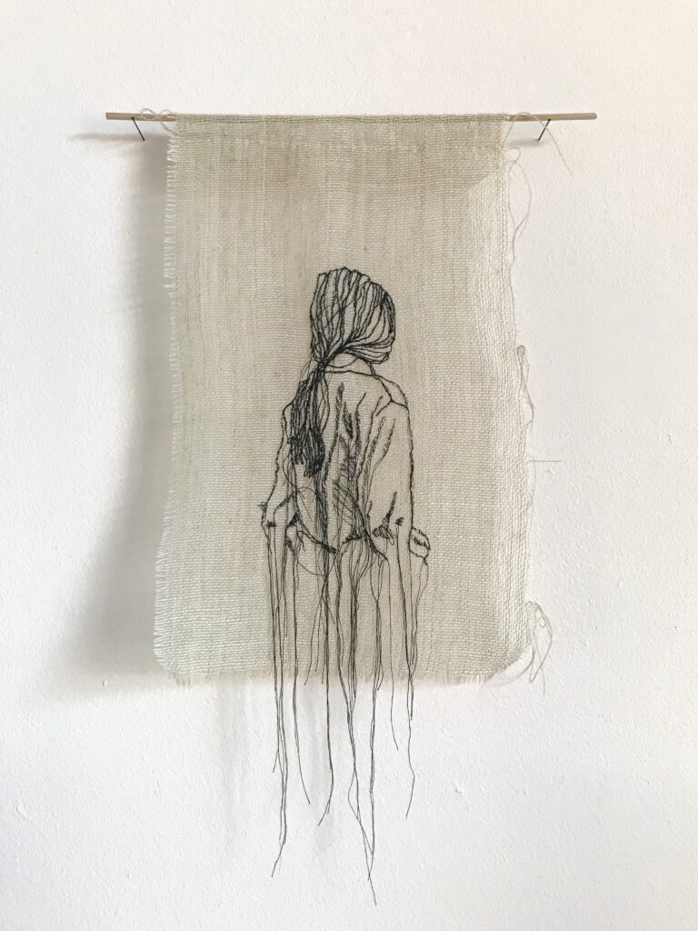 NL | Gefotografeerd fashion model geportretteerd in de vorm van embroidery art. Het artwork is geborduurd en geregen op een mix van katoen en wol. Doordat de stof heel grof is gewoven, en het artwork hierdoor niet strak kan worden geborduurd, ontstaan er een licht 3D effect. Door de transparantie lijkt het artwork te zweven op de stof.