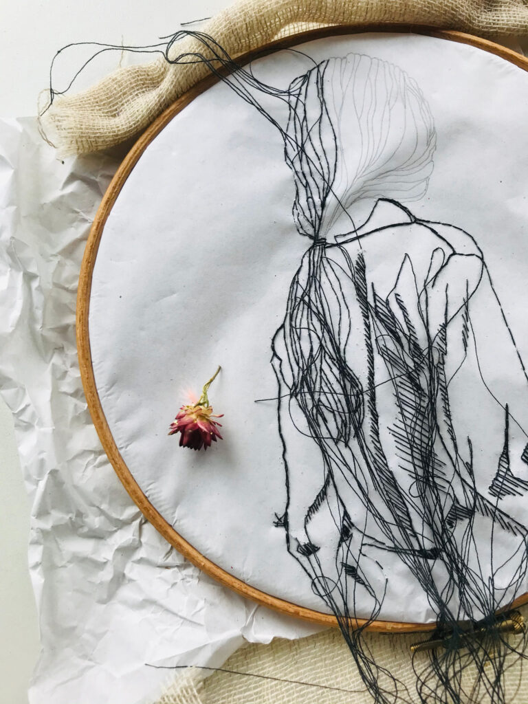 EN | The embroidery artwork is a self-portrait. I have taken myself as a starting point because as a human being I also sacrifice. I literally sacrificed myself to model the artwork.The slightly embroidered artwork indicates that sometimes I don’t feel seen, sometimes I let myself be placed in the background, but that I do belong to a whole. The black embroidered artwork is more prominent and has a clear view. She loves herself because she embraces herself and feels security. The tattoo sacrifice on her arm indicates that it has always been the case that people sacrifice themselves for themselves but also for others. The hanging threads show the drama but also the movement.