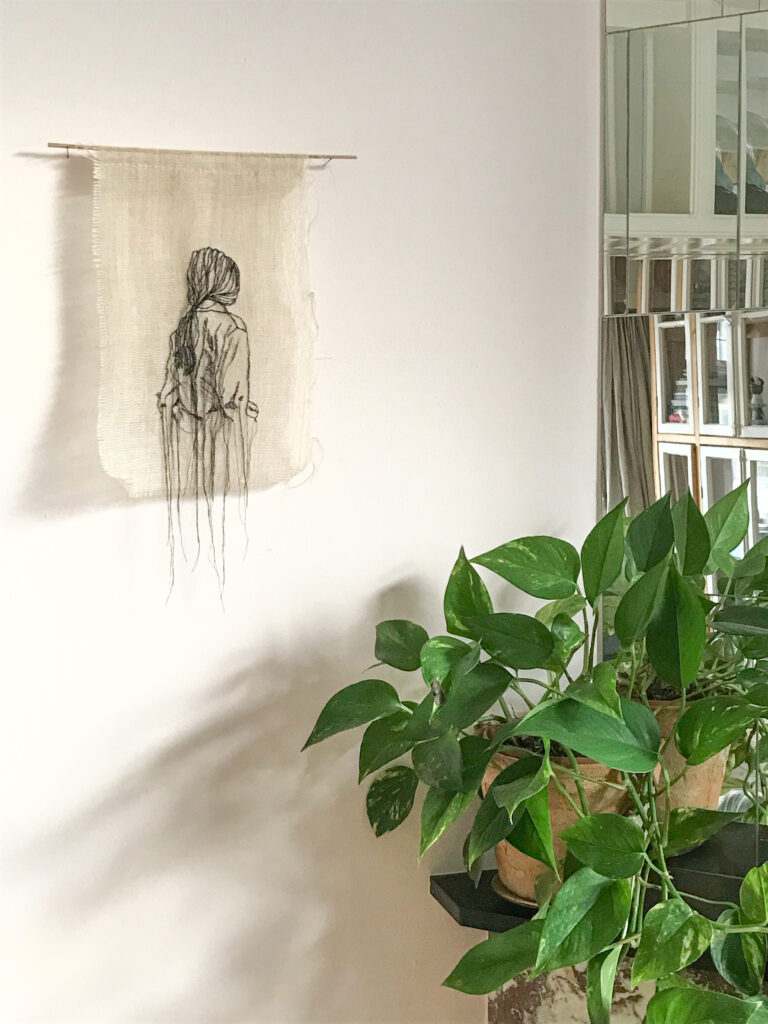 NL | Fragiel embroidery artwork van mijn eigen portret. Vormgegeven op en grof geweven wollen doek.