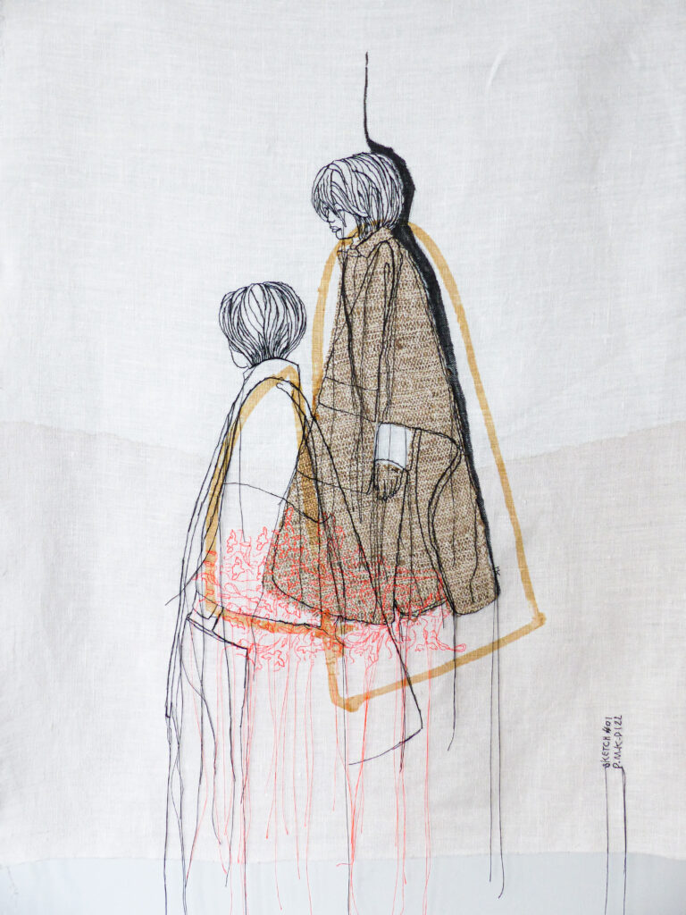NL | Het embroidery artwork is een zelfportret. Ik heb mezelf als uitgangspunt genomen omdat ik als mens ook offer. Ik heb mezelf letterlijk opgeofferd om het kunstwerk te modelleren. In het licht geborduurde persoon geeft aan dat ik me soms niet gezien voel, soms laat ik me op de achtergrond plaatsen, maar voel me een. De zwart geborduurde persoon valt meer op en heeft een duidelijk zicht. Ze houdt van zichzelf omdat ze zichzelf omhelst en veiligheid voelt. Het tattoo-offer op haar arm geeft aan dat het altijd zo is geweest dat mensen zichzelf opofferen voor zichzelf maar ook voor anderen. De hangende draden tonen het drama maar ook de beweging.