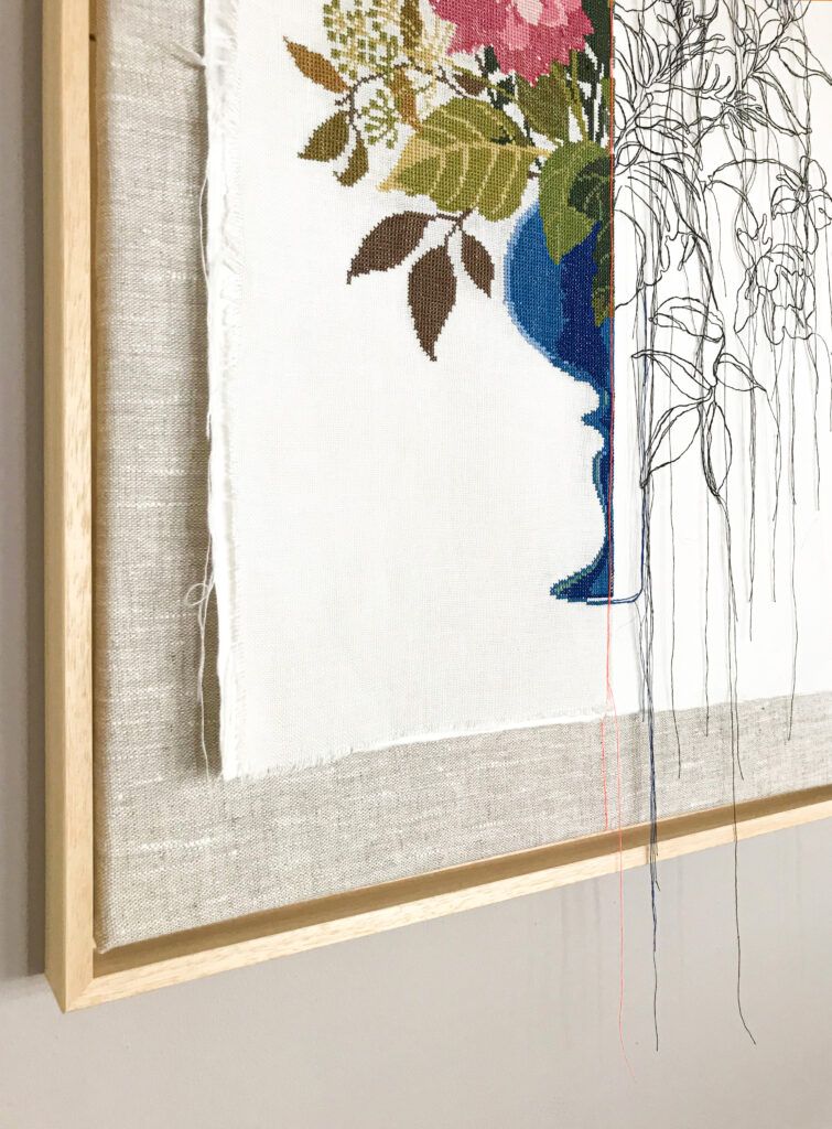 NL | Color Up… jouw leven! Zie jezelf als een wit canvas dat je kunt kleuren zoals je wilt. Het kunstwerk bestaat uit twee delen waarin het leven om je heen in kleur is ingevuld. Maar wat is jouw kleur? Hoe kleur jij je eigen leven? Kleur jij liever buiten de lijntjes of binnen een kader? Het artwork is gebaseerd op een oud werk dat ik combineer met mijn eigen borduurstijl.