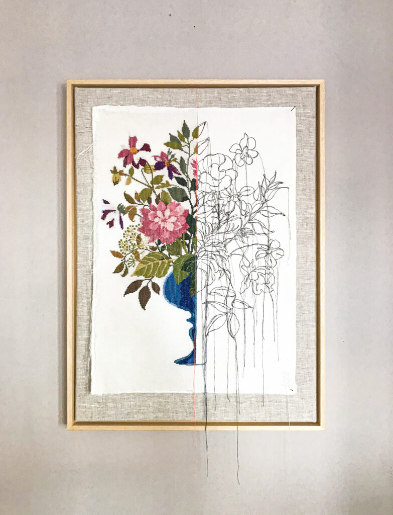 EN | A person is more than what you see. Self-portrait embroidered by hand in two different embroidery styles. The old-fashioned cross stitch that represents the left side of our brain in which we are able to make complex movements, our right half where emotions are central, drawn with thread.