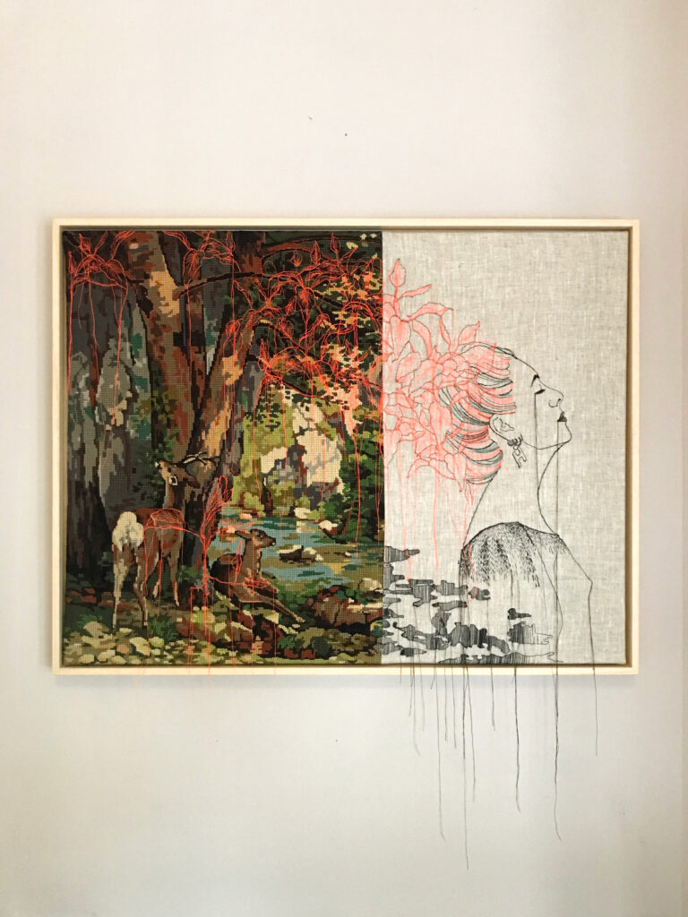 EN | With the hand – embroidered figurative embroidery art. Old embroidery revived in a new setting. For the project ” revive embroidery” I show 4 works that merge old and new embroidery. This work is an old embroidery based on a painting by the French artist Jean Honore Fragonard ” young reading girl” I found this old embroidery at the thrift store and gave it a new life with my own embroidery style.