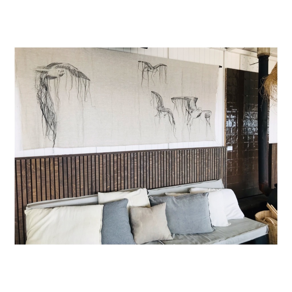 EN | Commissioned for AJUMA Beach. Two linen canvases depicting the seagulls of Zandvoort. The canvas has a total size of 370 wide and 110 high.