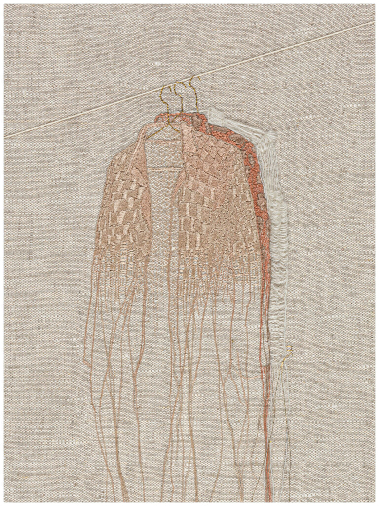 NL | Mohair op ruwe zijde in de vorm van een mouw. De mohairdraad is zorgvuldig gevormd om de details van de mouw te benadrukken. Door de mohair draad losser en verder uit elkaar te borduren, vervaagt de stof van de jas in de hoeken van het kunstwerk.