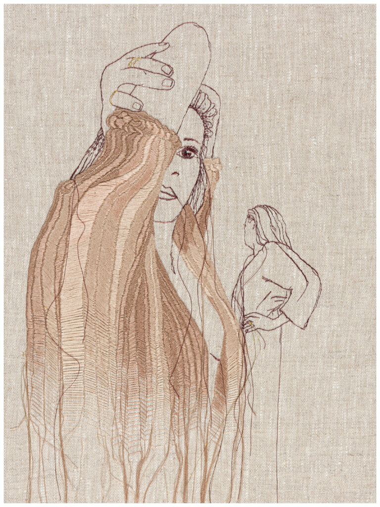EN | Photographed fashion model portrayed in the form of embroidery art. The artwork is embroidered and strung on a mix of wool and cotton. Because the fabric is very coarsely woven, and the artwork cannot be embroidered tightly, a 3D effect is created. The transparency makes the artwork appear to float on the fabric.