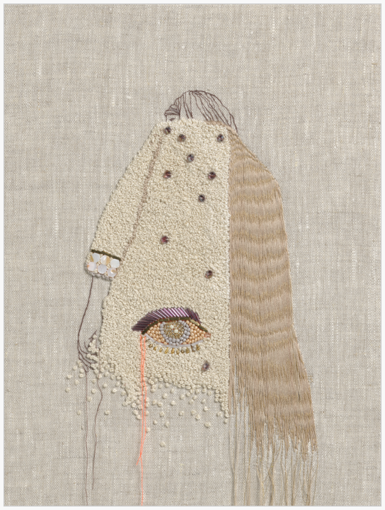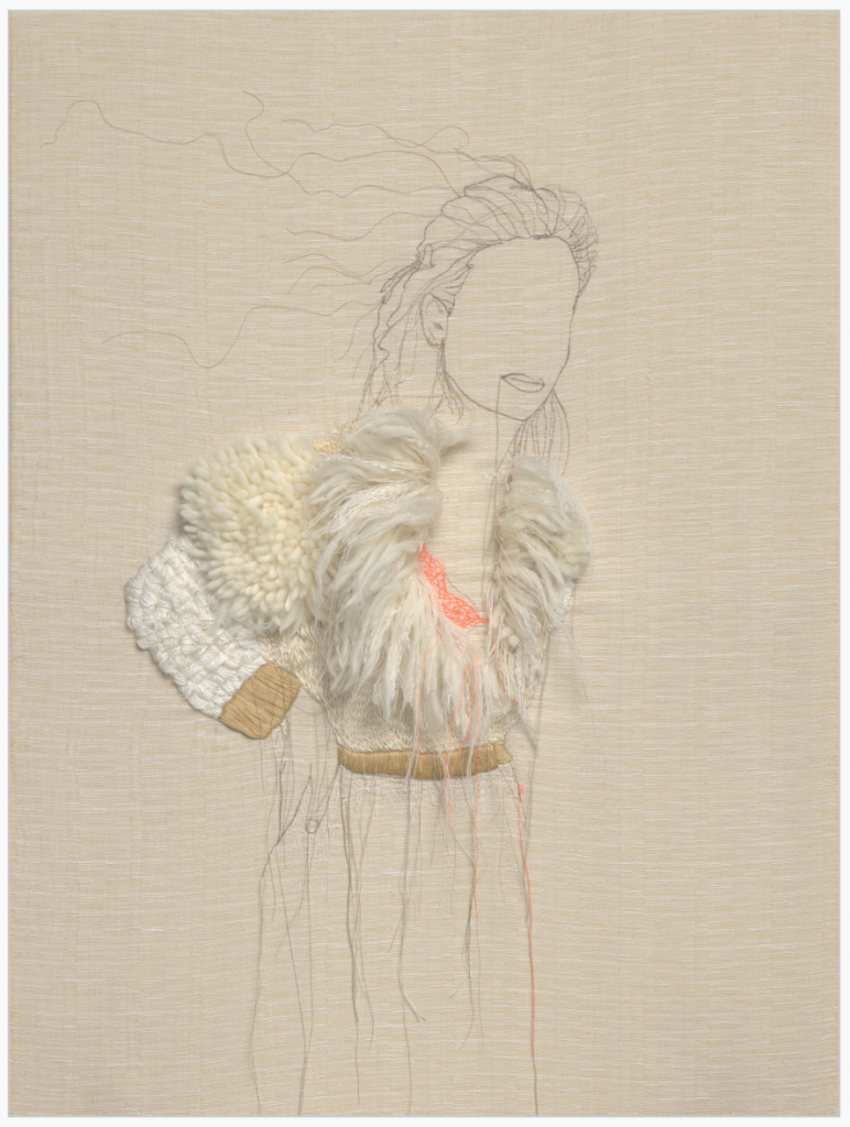 NL | Gefotografeerd fashion model geportretteerd in de vorm van embroidery art. Het artwork is geborduurd en geregen op een mix van katoen en wol. Doordat de stof heel grof is gewoven, en het artwork hierdoor niet strak kan worden geborduurd, ontstaan er een licht 3D effect. Door de transparantie lijkt het artwork te zweven op de stof.