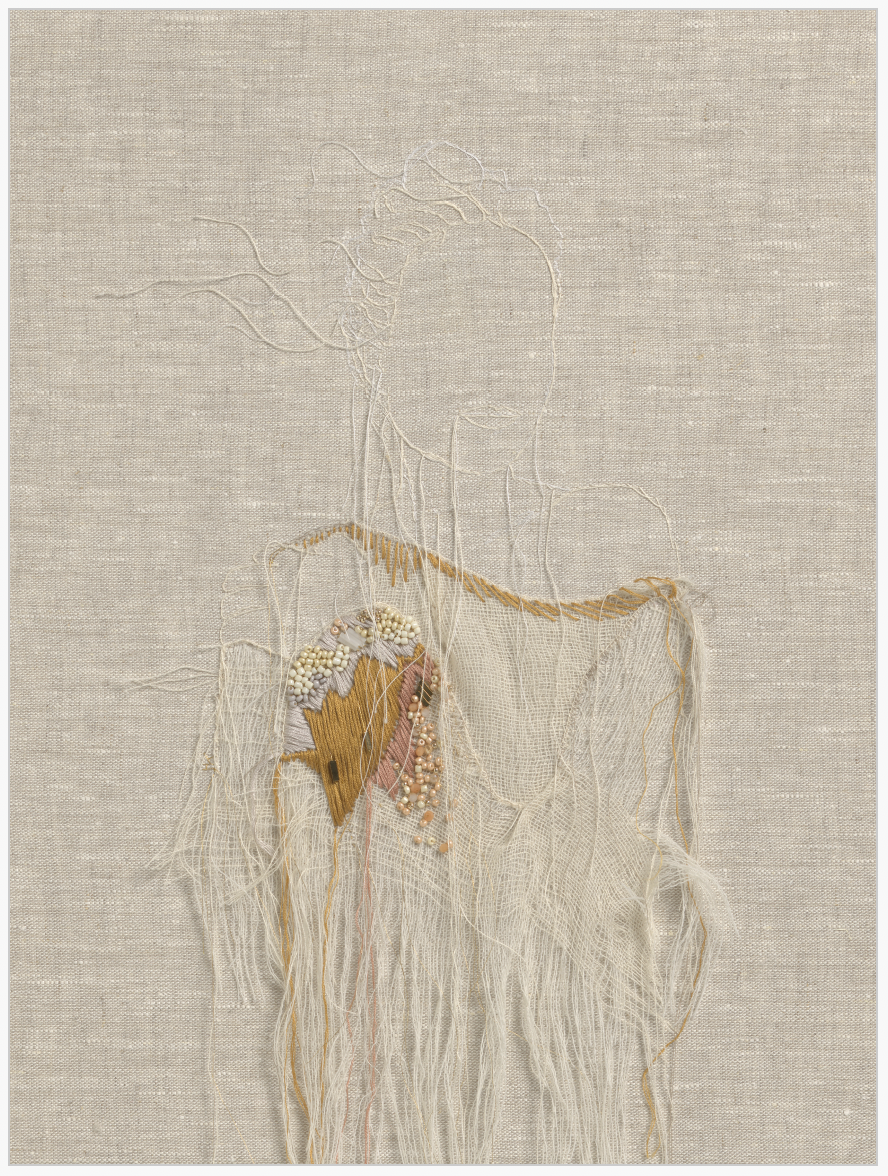 NL | Figuratief artwork waar een trui vormgegeven is uit enkel een lapje wol. De mouw is afgewerkt met verschillende kralen en borduurgaren.